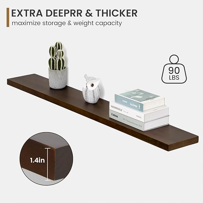 - Extra Deeper & Thicker for Storage - Each board measures 55"W x 8"D x 1.4"H. Extra deeper and thicker design in order to bring maximizes storage space and weight capacity, even hold up to 60 lb. This floating shelf taking up zero square feet, reduces clutter and highlights décor in compact spaces. It can help make full use of the empty wall, making it much more space-saving and making your room look larger and tidier.