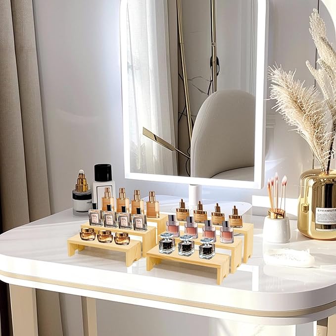 - ใWooden Tierd Risers for Displayใ๐: This 2 set 3 tier small display shelf for cupcakes or vendors has stackable nesting design, so the wooden display risers easily access as desktop storage racks,also they has strong load-bearing capacity for more kinds perfumes, collectible figures,kitchen condiment bottles, bathroom toiletries because of varieties size of (L7.8''/20cm-8.6''/22cm-9.4''/24cm)XW2.9'' /7.3cm