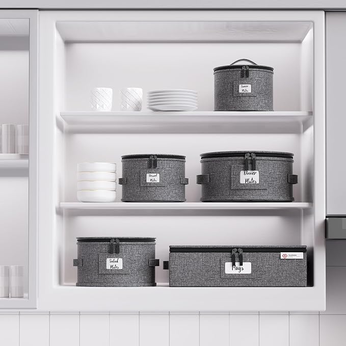 - 【China Storage Set 5】:These dinnerware storage containers includes 4 varying sizes dish case. One dinner plate case 11¾'', One salad plate case 10'', One dessert plate case 8½'', One saucer plate case 7'' and one coffee mugs storage case 4¼'' x 4¼'' and 5'' tall(for up to 12 cups). Also includes 11*4 felt plate dividers.