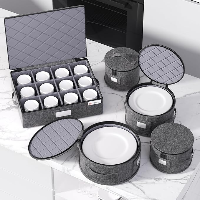 - 【Hard Shell Protection】:Our fine china storage containers are come with hard shell interior which can provide protection for your dinnerware, plate, dishes, glasses and mugs. The top is also hard shell design allows these containers to be stacked, enabling to save space when storing tableware in the kitchen.Perect for moving and storage.