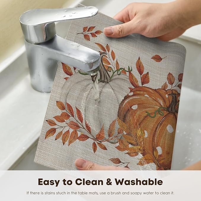 Artoid Mode Pumpkins Leaves Fall Vinyl Placemats Set of 4, Wipeable Colorful Printing PVC Place Mats for Party Kitchen Dining Decor, Beige