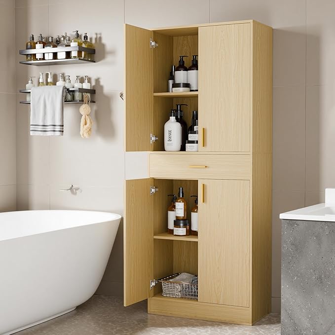 - Multi-Functional Cabinets: 13.4"D x 28"W x 70.8"H, this pantry cabinet includes 2 adjustable shelves and a large sliding drawer to meet your storage needs; In addition to organizing kitchen essentials, this tall cabinet can easily adapt to storing bathroom necessities or expanding the storage space living room