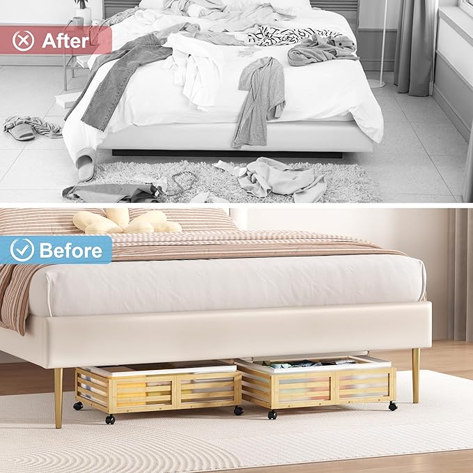 - ✅【Sturdy Under Bed Storage】:Our underbed storage units are built to last with high-quality 100% Real Bamboo,Beautiful appearance compared,oasting 4 rotating wheels with capacity of 120lbs, 48L large capacity dustproof cover bags hile the load-bearing capacity and durability are dramatically increased ,It's a versatile storage solution that can be customized based on your needs.