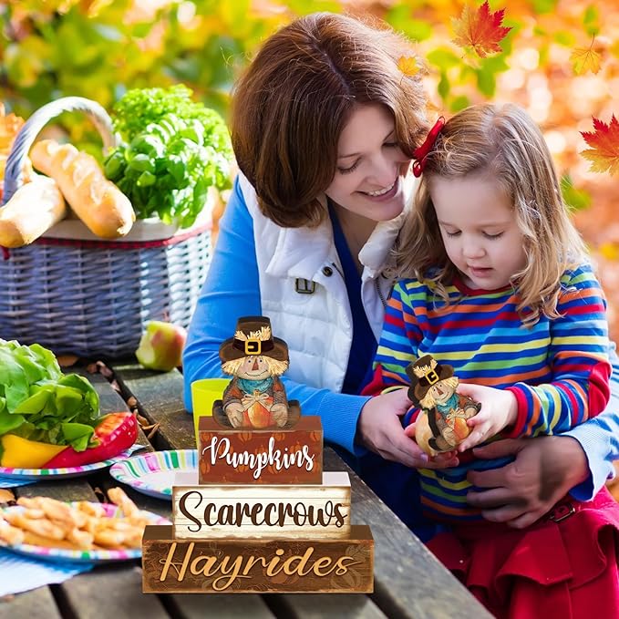 4 Pcs Fall Thanksgiving Decor for Home Cute Scarecrow Wooden Signs with Sayings Thanksgiving Fall Tiered Tray Decor Scarecrow Tabletop Centerpiece Hay Ride Block Signs for Office Kitchen Shelf