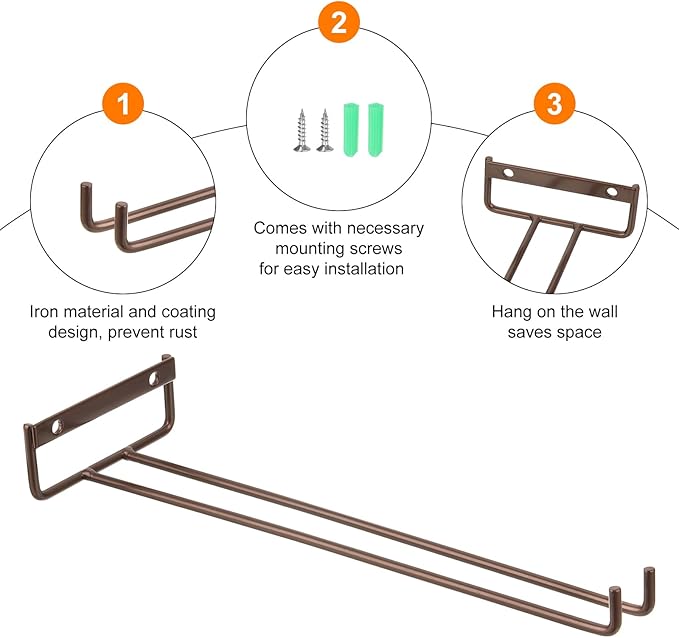 - [Easy to Install] Our wine glass rack comes with the necessary mounting screws for easy installation. You can only need to use a screwdriver to screw the provided screws into the wood of the cabinet. They fit perfectly under cabinets in a few minutes.
