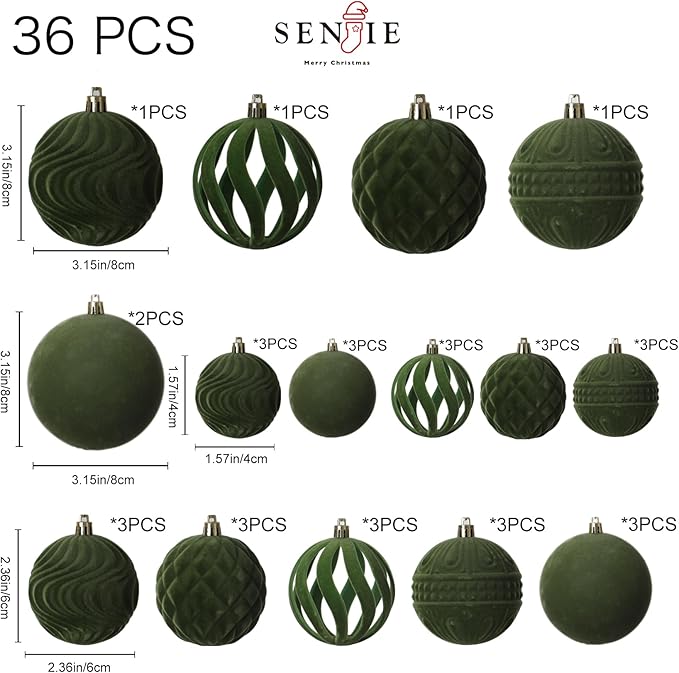 - Package List: the package contains 36pcs of flocked Christmas ball ornaments, measuring approx 3.15/2.36/1.57/inches in diameter, avocado green color,not only classic styles,but also innovative styles,including five shapes and nice texture can fully meet your needs for decorating