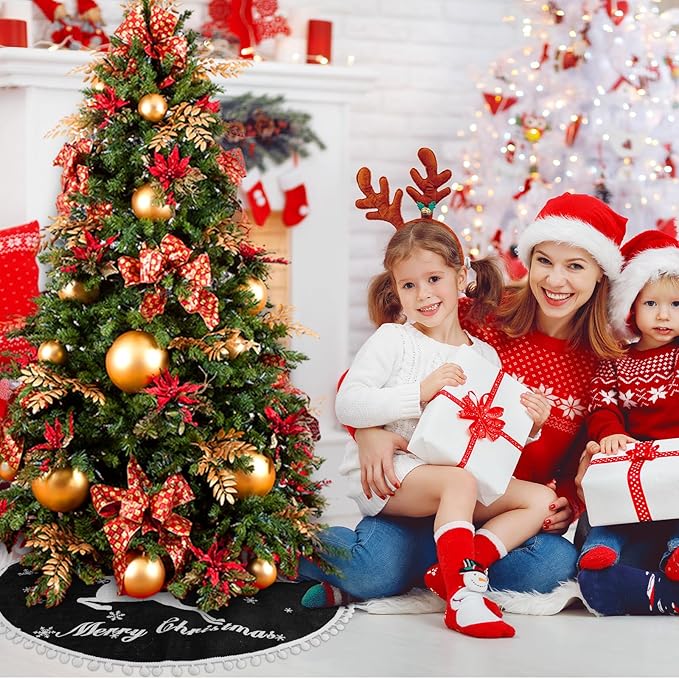 - Merry Christmas Tree Skirt:Our Christmas tree skirts is printed with elk and various sizes of snow patterns, as well as the words "Merry Christmas." The edges are adorned with small, fluffy balls, adding a festive touch to your Christmas tree. This 48-inch tree skirt is perfectly sized for most Christmas trees perfectly. Before making a purchase, please measure the diameter of your tree to ensure a perfect fit