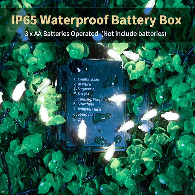 - 【Battery operated】3 AA batteries (Not included) operated, 2 pack 18 feet 50 mini LED strands, 3.94 inch lights spacing with compact water resistant battery control box, energy saving and eco-friendly. Operation time depends on the running time and the quality of installed battery