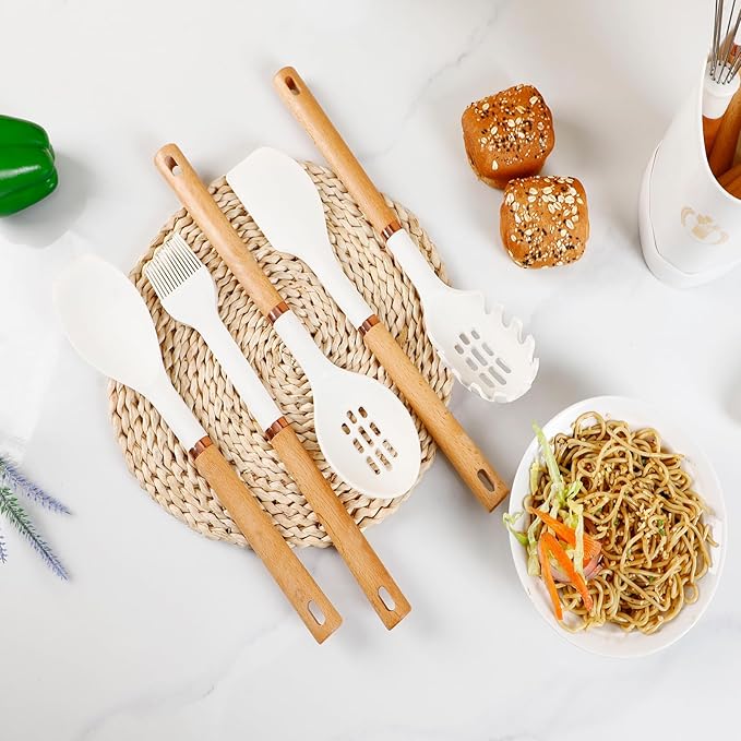 13-Piece silicone utensil set wood handle nonstick cookware safe dishwasher safe kitchen tools BPA free heat resistant (450°F/230°C) ceramic pan safe cooking gifts housewarming (White)
