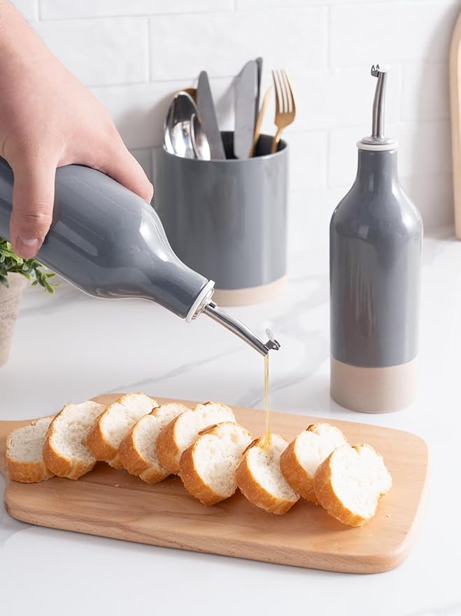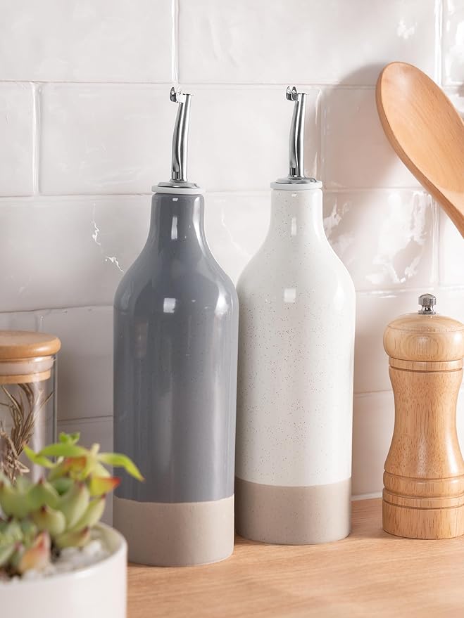 - ELEGANT OLIVE OIL DISPENSER BOTTLE - Our ceramic oil dispenser is handmade and batch fired at extremely high temperatures, forming a smooth glaze and providing a resilient surface for strength and durability, easy to clean and dishwasher safe for long-term use