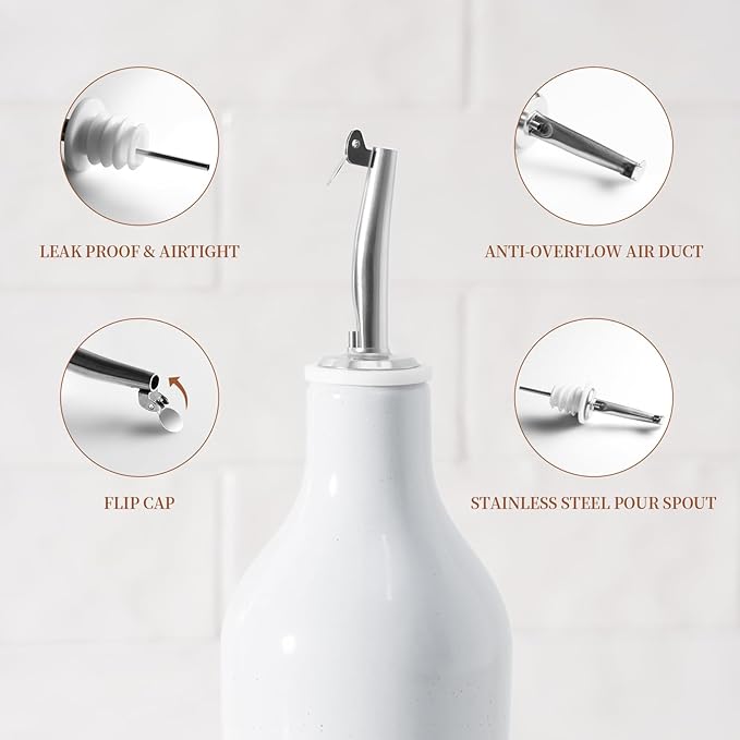 - KEEPS OIL FRESH - Exposure to light can cause olive oil to go rancid. This opaque olive oil dispenser bottle ceramic protects your olive oil or vinegar from harmful UV rays, keeping it fresh longer