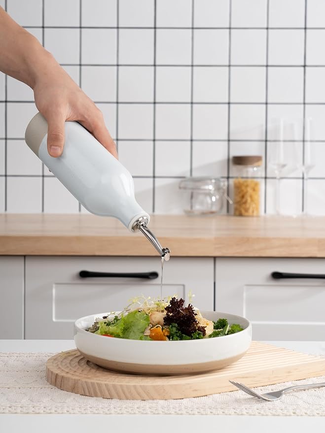 - ELEGANT OLIVE OIL DISPENSER BOTTLE - Our ceramic oil dispenser is handmade and batch fired at extremely high temperatures, forming a smooth glaze and providing a resilient surface for strength and durability, easy to clean and dishwasher safe for long-term use
