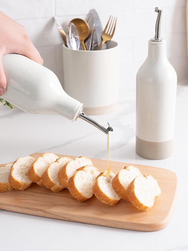 - ELEGANT OLIVE OIL DISPENSER BOTTLE - Our ceramic oil dispenser is handmade and batch fired at extremely high temperatures, forming a smooth glaze and providing a resilient surface for strength and durability, easy to clean and dishwasher safe for long-term use