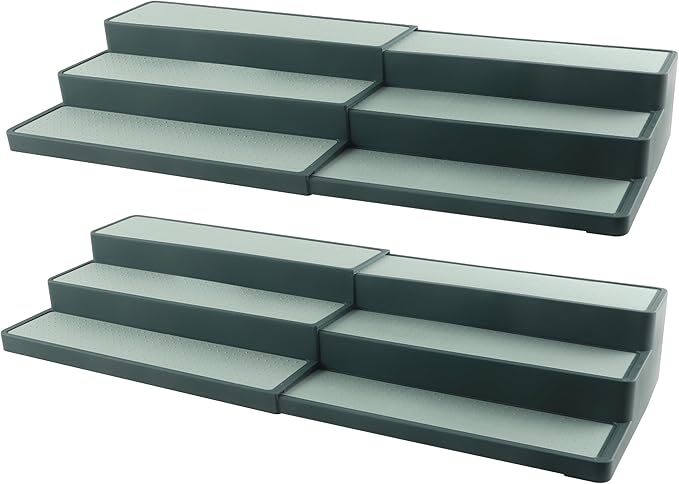 - SET INCLUDES: The 3 tier shelf set comes with 2 racks, the 3 levels increase visibility and easy access to the items on your kitchen counter or cabinets. Deep shelves helps to prevent spills from spreading.