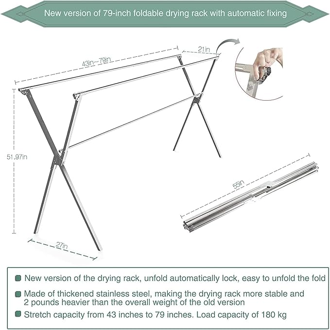 Clothes Drying Racks Outdoor, 82 Inches Updated Version,Stainless Steel Laundry Drying Rack for Indoor Outdoor and The Balcony,Length Adjustable Saves Space,with Windproof Hooks(004)