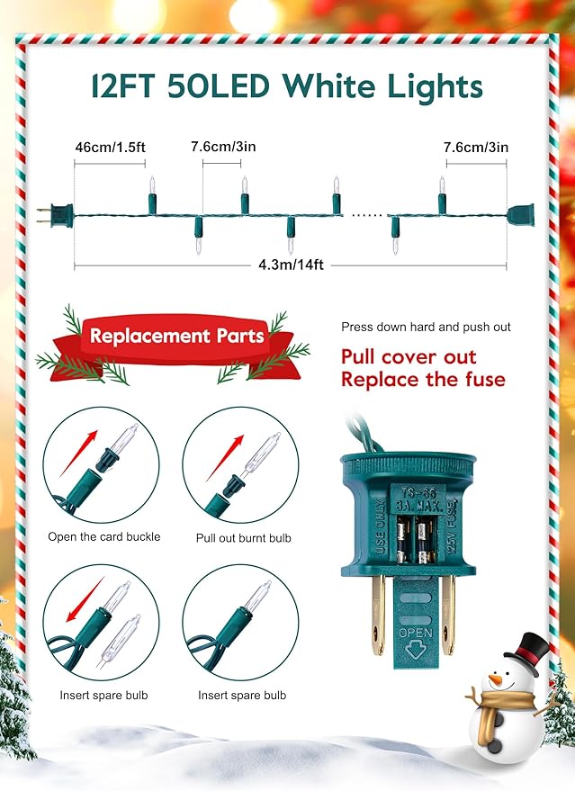 - Creative Mini Christmas Lights Set: Brightown Christmas light component of Christmas-green wire and 50 counts of transparent fairy incandescent mini lights, the total length of the string light is 13 feet, and each bulb is 3 inches apart. You can connect our indoor string light end-to-end to up to 10 creative light strings to meet your any decoration needs