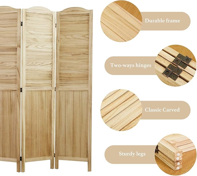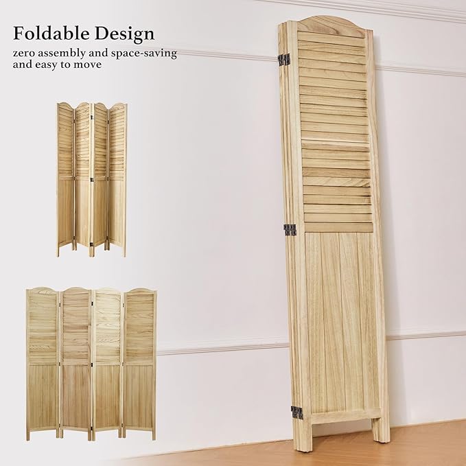 - 【Classic Louver & MDF Design】The upper portion of the screens is ingeniously designed with louver, facilitating the ingress of sunlight and ensuring ventilation. The lower part of the wall divider is crafted from MDF, imparting additional weight and stability to the dividers. It emerges as an ideal option for those seeking a robust and long-lasting product. The top of the screen boasts a French-inspired rounded design, presenting a harmonious blend of practicality and aesthetic appeal.