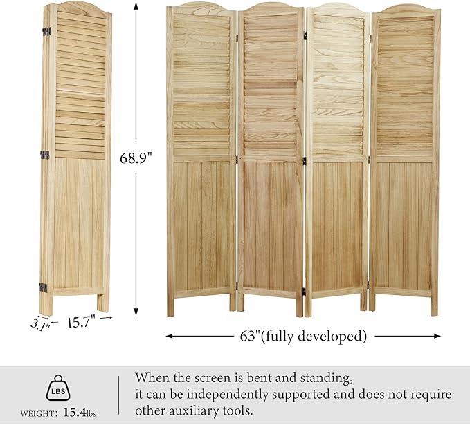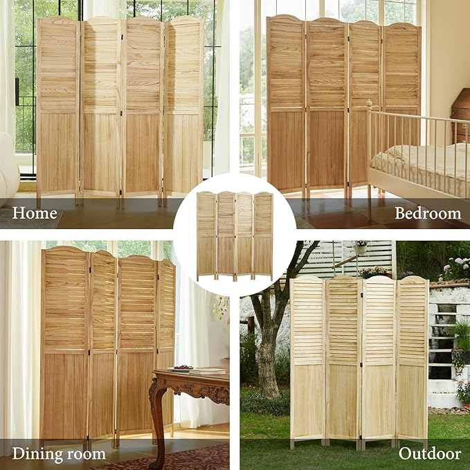 Room Partitions and Dividers, 68.9 Inch Temporary Wall with Double Hinges, Wooden Louver & MDF Stable Screens for Home Office Bedroom Coffeehouse Decoration (4 Panels, Wood Color)