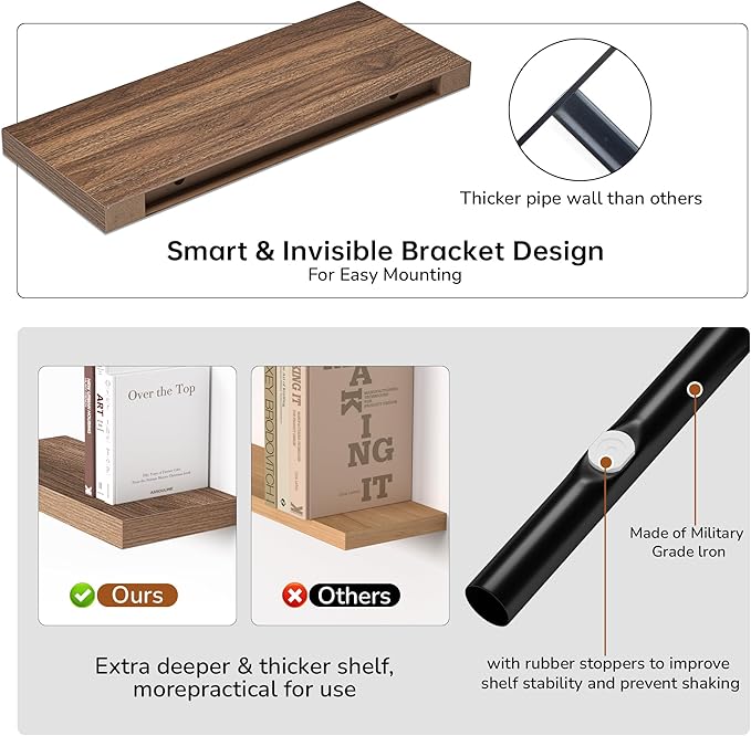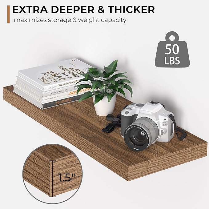 - Extra Deeper & Thicker - Each board measures 24"W x 9"D x 1.6"H. Extra deeper and thicker design in order to bring maximizes storage space and weight capacity, even hold up to 50 lb each. This floating shelf taking up zero square feet, reduces clutter and highlights décor in compact spaces.