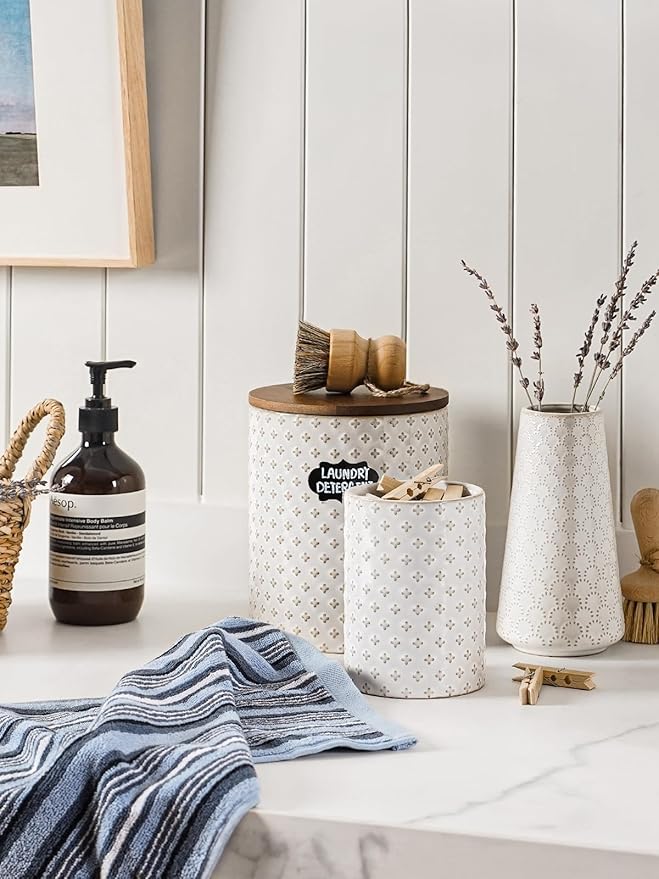 - Embossed Design: Featuring an arctic white glaze with a charming embossed pattern, these farmhouse-style ceramic jars will add warmth and vitality to your home. Their elegant design complements various home styles, making them the perfect addition to your countertop or coffee corner. Enhance your home’s aesthetics and let these jars become a standout decorative element in your living space