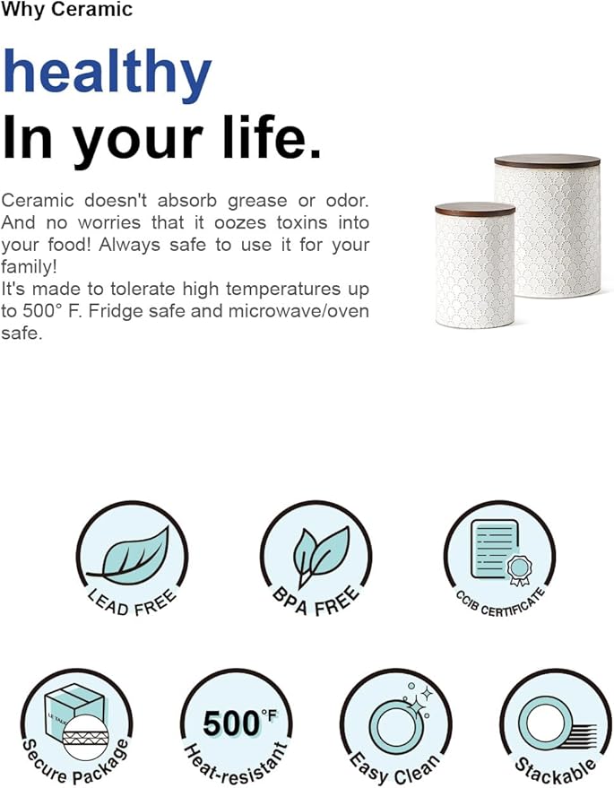 - Premium Ceramics and Lids: Made from high-temperature-fired ceramics, these jars contain no lead or cadmium and are heavy enough to resist tipping over. They are insulated, moisture and humidity resistant, and more suitable than plastic for storing items away from light. They are easy to clean and dishwasher safe. The lids are made of Acacia wood, which is more durable, moisture-resistant, and aesthetically pleasing than ordinary wood. Please note: Wooden lids are recommended to be hand-washed