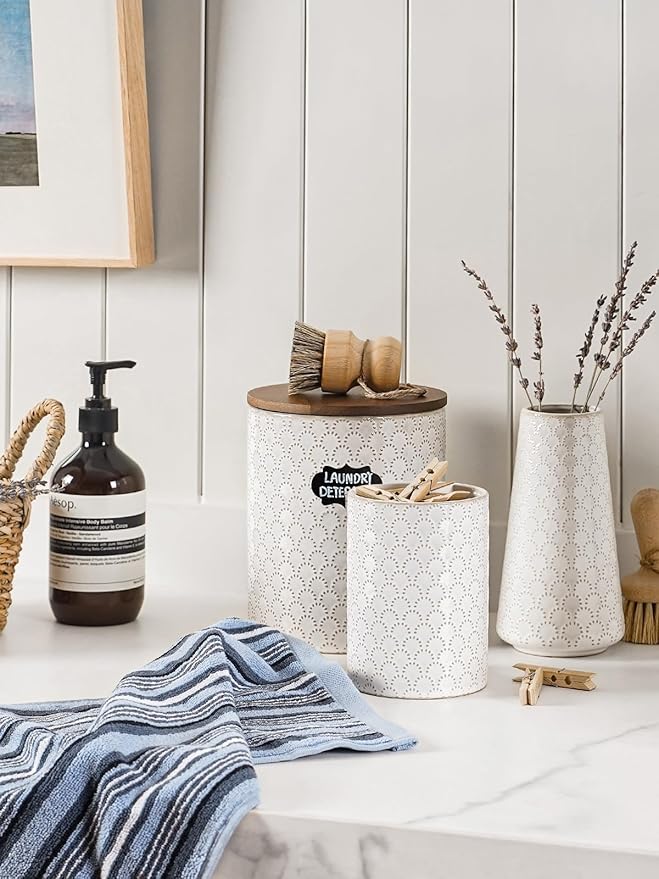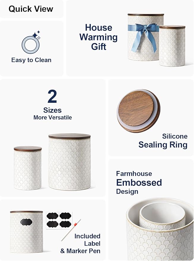 - Embossed Design: Featuring an arctic white glaze with a charming embossed pattern, these farmhouse-style ceramic jars will add warmth and vitality to your home. Their elegant design complements various home styles, making them the perfect addition to your countertop or coffee corner. Enhance your home’s aesthetics and let these jars become a standout decorative element in your living space