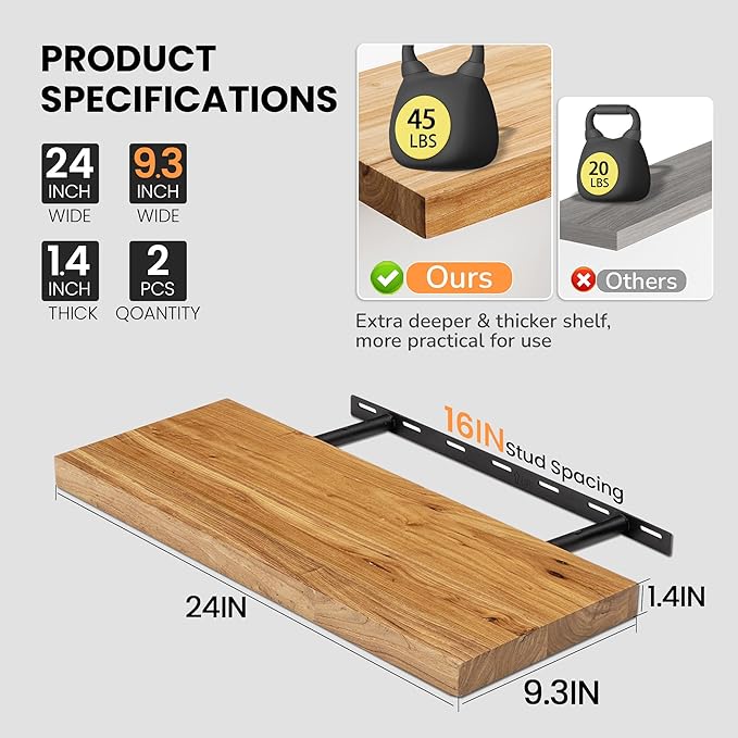 - 9.3" DEEP SOLID ELM WOOD: Fun Memories flat-edge floating shelves are handcrafted from reclaimed elm wood and measure 24" x 9.3" x 1.4" each. Featuring natural grain, knots, and color variations, they add warmth and rustic charm to any space. Mount them vertically, side by side, or in corners for a clean, stylish look