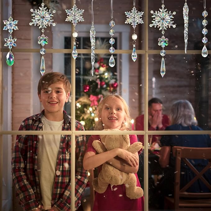 • EASY TO USE: Each crystal snowflake and icicle pendant ornament comes with a built-in rope for effortless hanging. Simply thread the rope through the included hooks or hang them directly from tree branches, door frames, or ceiling hooks. The convenient hanging design makes decorating a breeze and ensures your ornaments stay securely in place, whether on Christmas tree, doors, walls, or windows