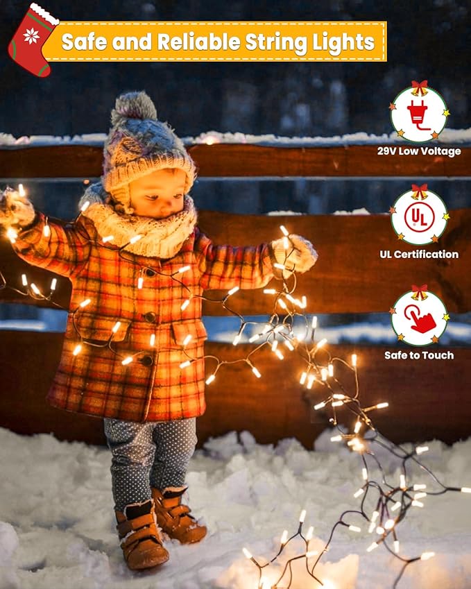 - Outdoor Waterproof & UL Certified: These Outdoor Christmas lights are UL certified, the output voltage is 29V, low voltage power supply, safe to touch, and will not heat after long-term use, no worries about your kids and pets, great for indoor Christmas tree decoration. Compared with traditional Xmas tree lights, it can save 90% of energy. The Christmas twinkle lights outdoor have an IP44 waterproof rating and can withstand rain, snow, and various weather conditions (Note: The adapter is not waterproof)