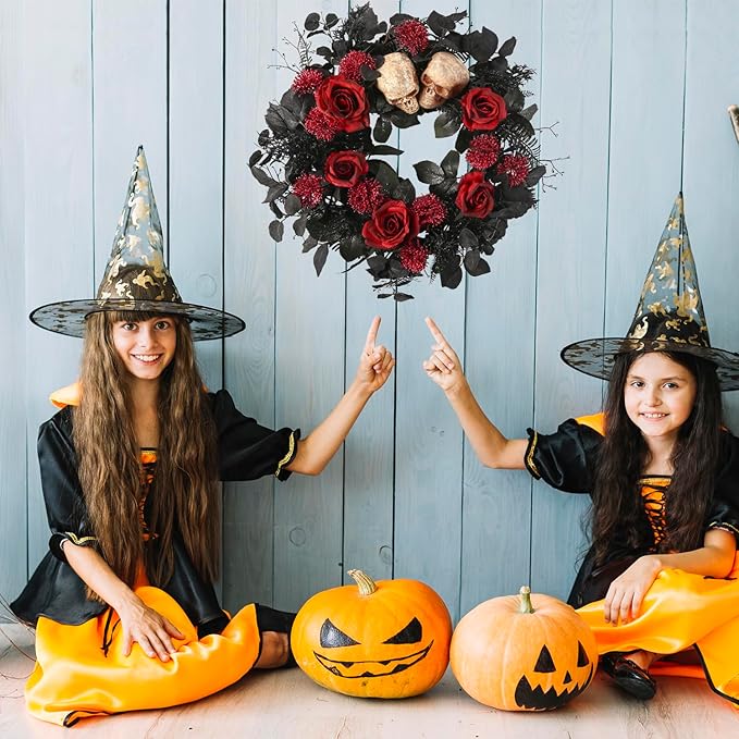 - ๐ Festive Wreath: Celebrate Halloween with this 20-22 inch wreath adorned with black glitter eucalyptus leaves, red roses, skull, and berries, creating a gothic and spooky ambiance.
