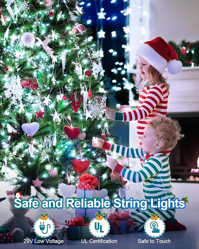 - Outdoor Waterproof & UL Certified: These Outdoor Christmas lights are UL certified, the output voltage is 29V, low voltage power supply, safe to touch, and will not heat after long-term use, no worries about your kids and pets, great for indoor Christmas tree decoration. Compared with traditional Xmas tree lights, it can save 90% of energy. The Christmas twinkle lights outdoor have an IP44 waterproof rating and can withstand rain, snow, and various weather conditions (Note: The adapter is not waterproof)