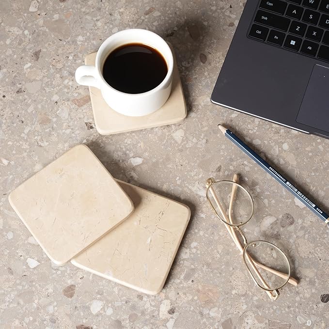 - Premium Solid Marble Coasters Set of 5: Handcrafted from natural Crema Beige marble, these square coasters feature unique veining for elegant table decor. Ideal for elevating your coffee table, office desk, or bar setup with timeless luxury
