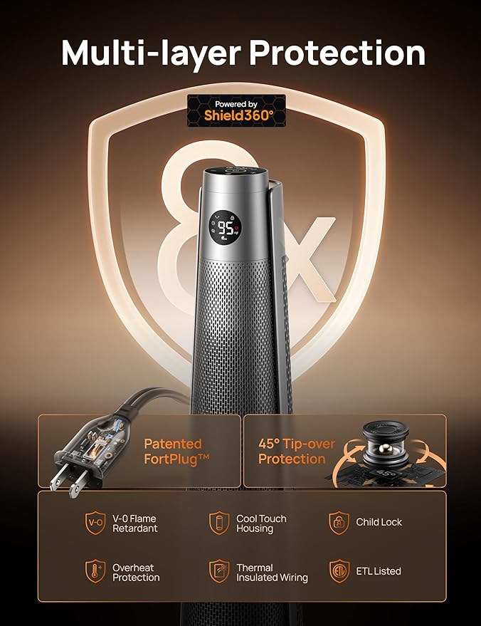 - All-around Safety: Stay warm this winter with peace of mind. Our heaters for indoor use offers 8 comprehensive protections, including V0 flame-retardant material, cool-touch housing, FortPlug, thermal insulated wiring, child lock, 45° tip-over protection and overheat protection, all certified by ETL.