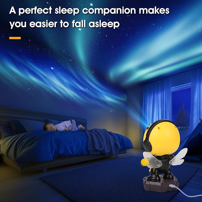- Cartoon Bee Toys Projector: Our Deerdance star lights projector fills a room with magical twinkling stars and flowing auroras, creating a cozy ambiance perfect for kids' bedtime stories. This charming Northern Lights projector also helps reduce the fear of the dark, fostering a peaceful sleep environment. It makes a wonderful Christmas gift and toy for both boys and girls