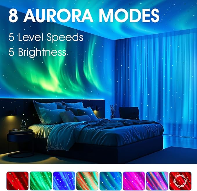 - 8 Hypnotic Aurora Modes: Bring the awe-inspiring Northern Lights into your home with 8 customizable aurora settings. Watch the colors dance across your walls and ceiling with 5 adjustable flow speeds. Whether you're setting a subtle ambiance or a vibrant display, this star projector offers 5 brightness levels to fit any mood