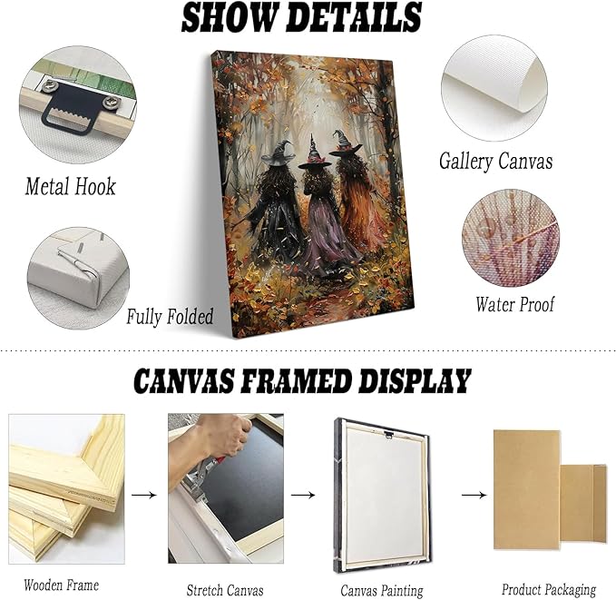 - Easy To Hang:Retro Halloween Print Frame wall art Poster size:12*16inchs. Whimsical ghost art already stretched on solid wooden frames, gallery wrapped, with hooks and accessories, ready to hang. The painting can be easily hung in any room you like and is very convenient. This unique print captures the essence of classicwitchcraft and Gothic,adding an eerie touch to any space.