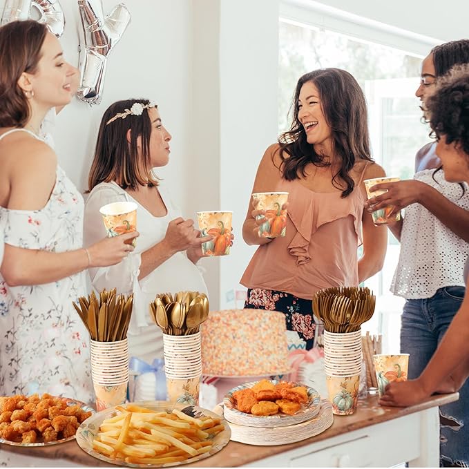 - Elegant Party Package For 50: the exquisite fall party tableware set includes 50 pieces of 9-inch dinner paper plates, 50 pieces of 7-inch dessert paper plates, 50 pieces of napkins, 50 pieces of 9 oz paper cups, and 50 plastic cutlery sets; All ripe in attractive pumpkin style designs; Ensure your party has the concept of sophistication without compromising on quantity