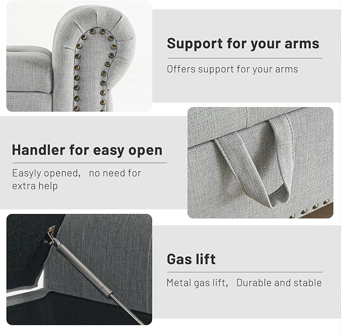 - ·Top-quality Planks&Sophisticated Mechanics: The ottoman bench frame made of multi-layer solid wood planks offers excellent breathability, durability, and support. The easy-lift and soft-close mechanism of the composite hinge and support arm structure ensures that the seat surface opens smoothly. It allows for easy and slow closure, providing a safe and effortless user experience.