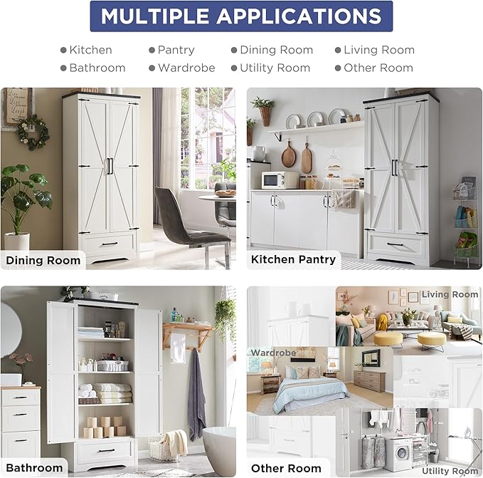 - Multi-Purpose: This tall pantry storage cabinet with doors and shelves and drawers boasts an immense storage capacity. A true multi-purpose marvel, it adapts seamlessly to diverse needs. Be it your food kitchen pantry storage for cutlery, plates, and spices, or your bathroom need for towel and toiletry management, even in utility room miscellany – this wooden farmhouse storage cabinet emerges as the quintessential choice