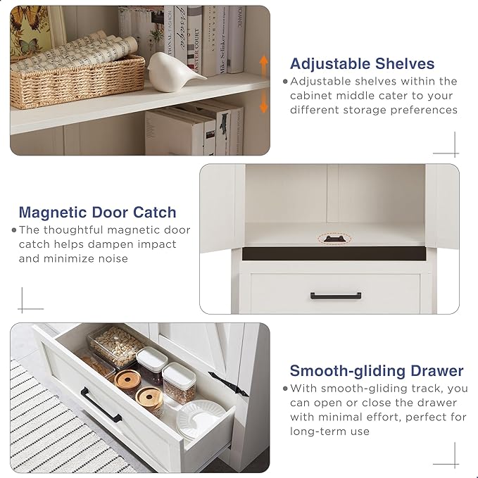 - Generous Storage: This kitchen pantry cabinet measures 32" W x 16" D x 71" H, with drawers sized at 26" W x 11" D x 9" H. Spacious and versatile storage, keeps your room organized and beautifully decorated. The two middle shelves within the cabinet are both adjustable and removable, featuring three height options that cater to your different storage preferences