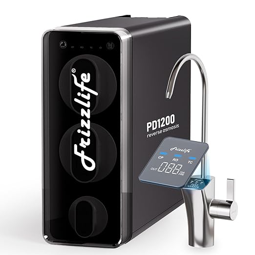 - [No Tank Design & Long Service Life] Frizzlife PD1200 RO water filter system with Tankless design prevents potential secondary contaminants pollution brought by the pressure tank. Guaranteed to provide ultra-pure, safe, and clean water for you and your family. Meanwhile, it saves at least 70% space undersink. Two huge filter cartridges loaded, the service life of the system is ultra-long.