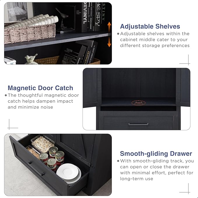 - All-matching Farmhouse Elegance: Our tall kitchen storage cabinet features a sleek rectangular silhouette with 2 classic barn doors. The rustic wood texture finish, accompanied by the touch of black metal accents, masterfully fuses modern rustic aesthetics with the warmth of vintage farmhouse charm. It effortlessly breathes personality and grace into your kitchen or living room, seamlessly complementing any furniture and decor style you embrace