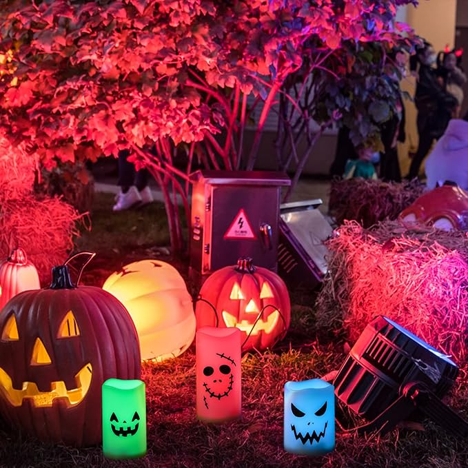 - Halloween Decorations Candles: Printed design with 3 different ghost face, as your Halloween Bedroom, Living room, Windows, Desk, Fireplace, Hallway, Table Centerpiece decoration, plastic material with waterproof function, can also be used for camping, outdoor Halloween party decorations