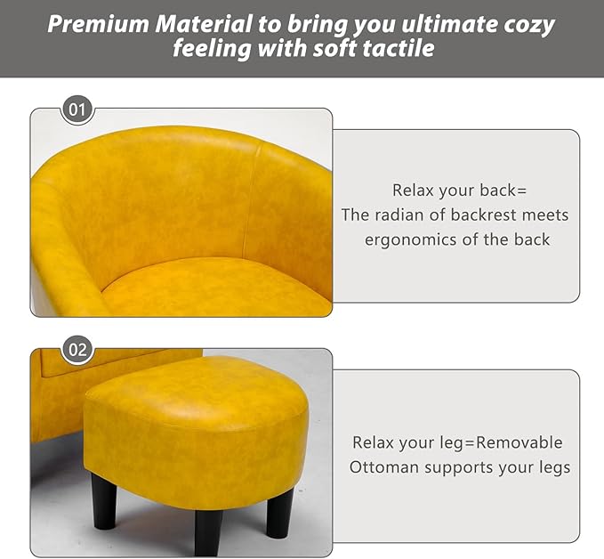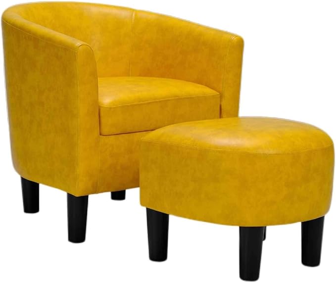 INZOY Modern Accent Chair with Ottoman for Small Space, Club Chair with Ottoman Set, Comfy PU Leather Barrel Reading Chairs for Living Room Bedroom, Round Reading Chair with Foot Rest, Yellow