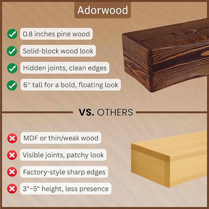- GENUINE PINE WOOD TEXTURE: Each piece reveals natural knots, small cracks, and unique distressing, ensuring every mantel is one-of-a-kind. Due to the inherent characteristics of real wood, the grain and color may slightly differ from the samples shown.