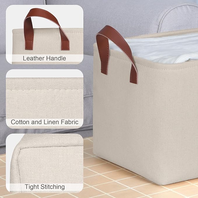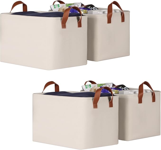 KEEGH Storage Baskets for Organizing, Fabric Storage Bins for Shelves with Leather Handle, Shelf Baskets for Closet Organization Closet Organizer Bins for Clothes, 15" L x 11" W x 10" H, Beige, 4 Pack