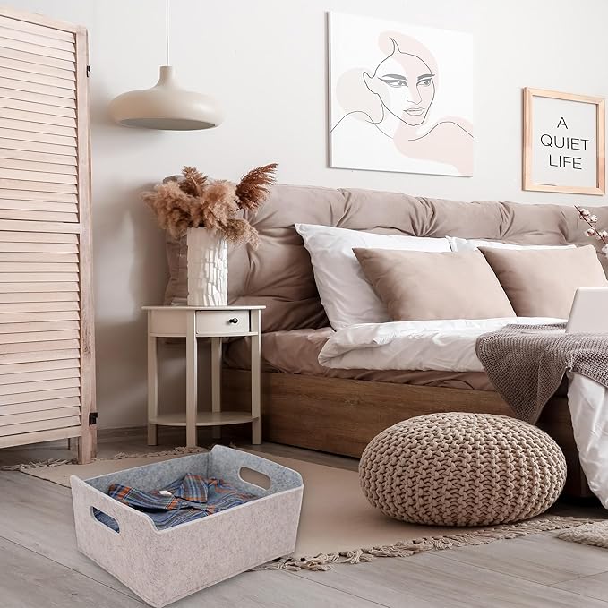 - 【Sustainable material】 Recycled felt with comfortable touch feeling, soft to prevent scratching,flexible for space saved up on desk, office ,bedroom, closet ,kitchen,bathroom or anywhere you desire with these stylish storage and organizer bins.