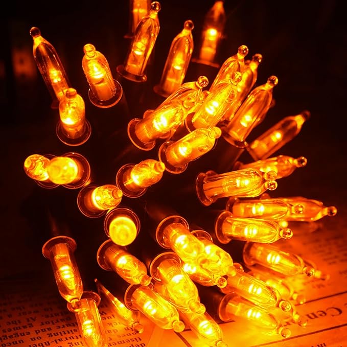 - 【Spooky Mini String Lights】 2 Pack Orange Halloween Lights Total 100 LED spaced 0.3Ft apart, with a total length of 32Ft. These Halloween Mini Lights emit a haunting orange glow, perfect for setting a spooky scene in your haunted house or Halloween party.