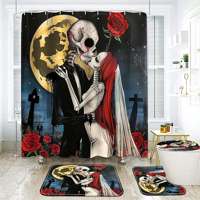 NEWSUYAA Halloween Decorations Shower Curtain Set with Non-Slip Rugs and Bath Mats,Black Skull Skeleton Bathtub Curtains with 12 Hooks,All Saints'Day (Nov 1st) Bathroom Decor