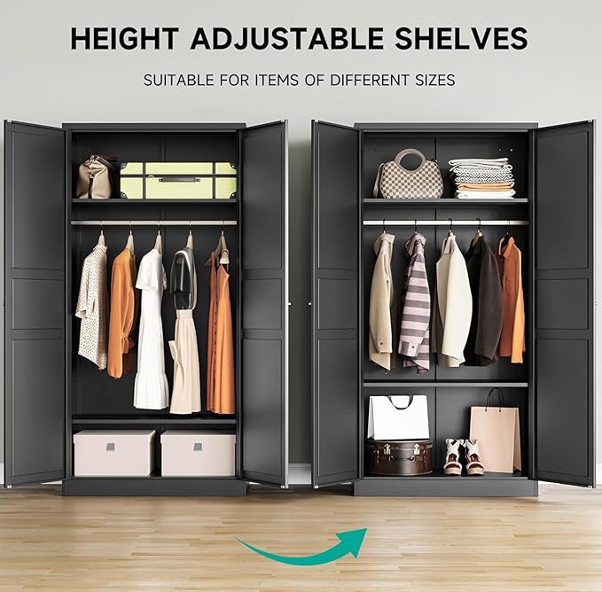 SISESOL Metal Wardrobe Cabinet with Hanging Rod,Black Armoire Wardrobe Closet,Metal Clothing Storage Cabinet with Adjustable Shelves and Doors,72" Cloth Storage Cabinets for Home,Living/Laundry Room